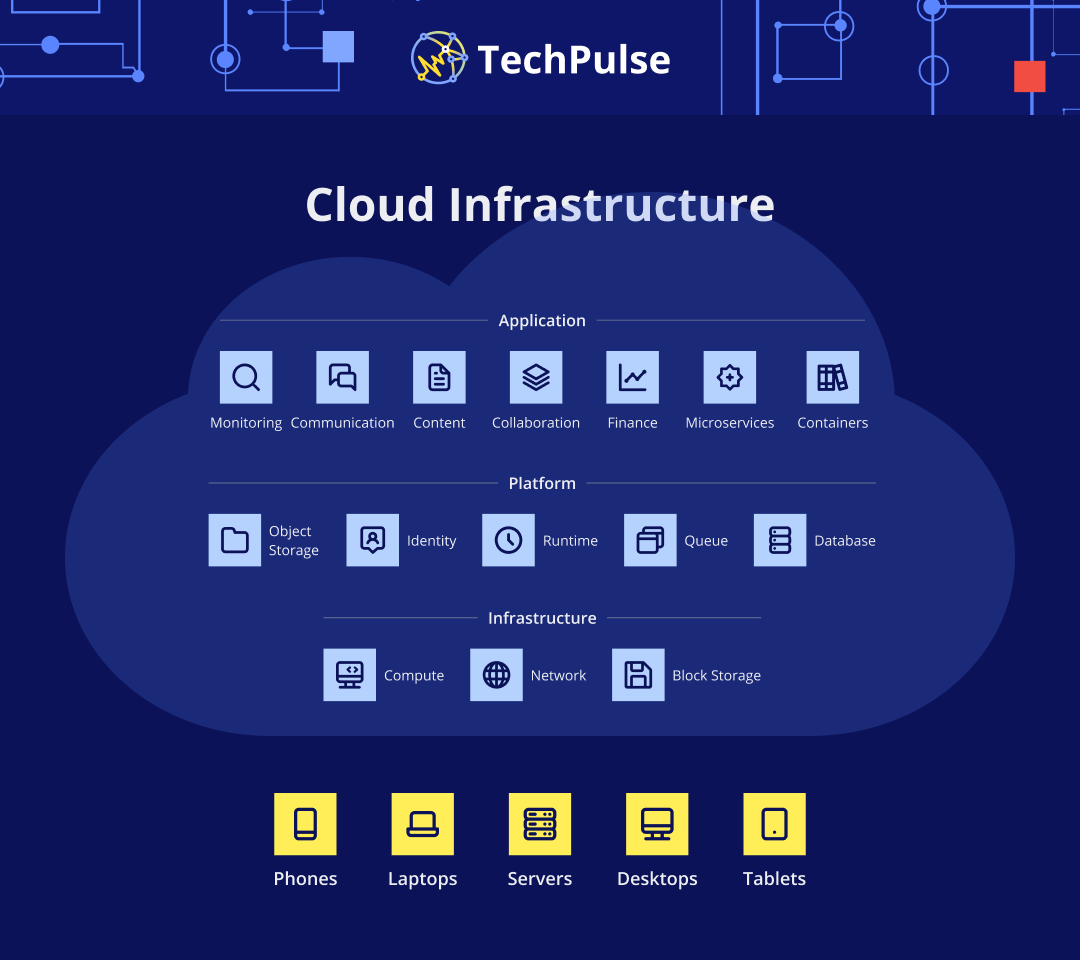 Key components of cloud-native architecture, including microservices, containers, and cloud infrastructure.